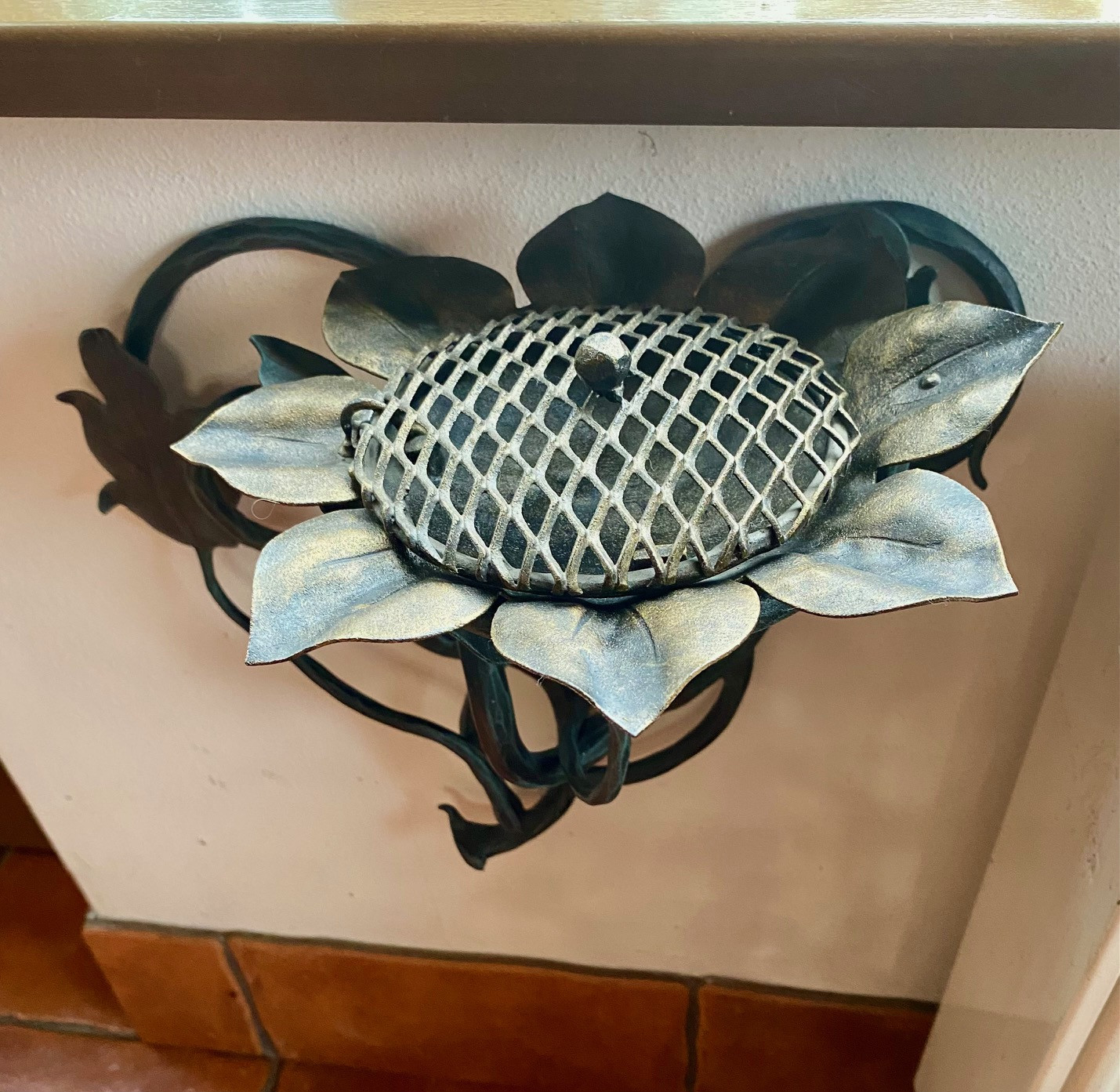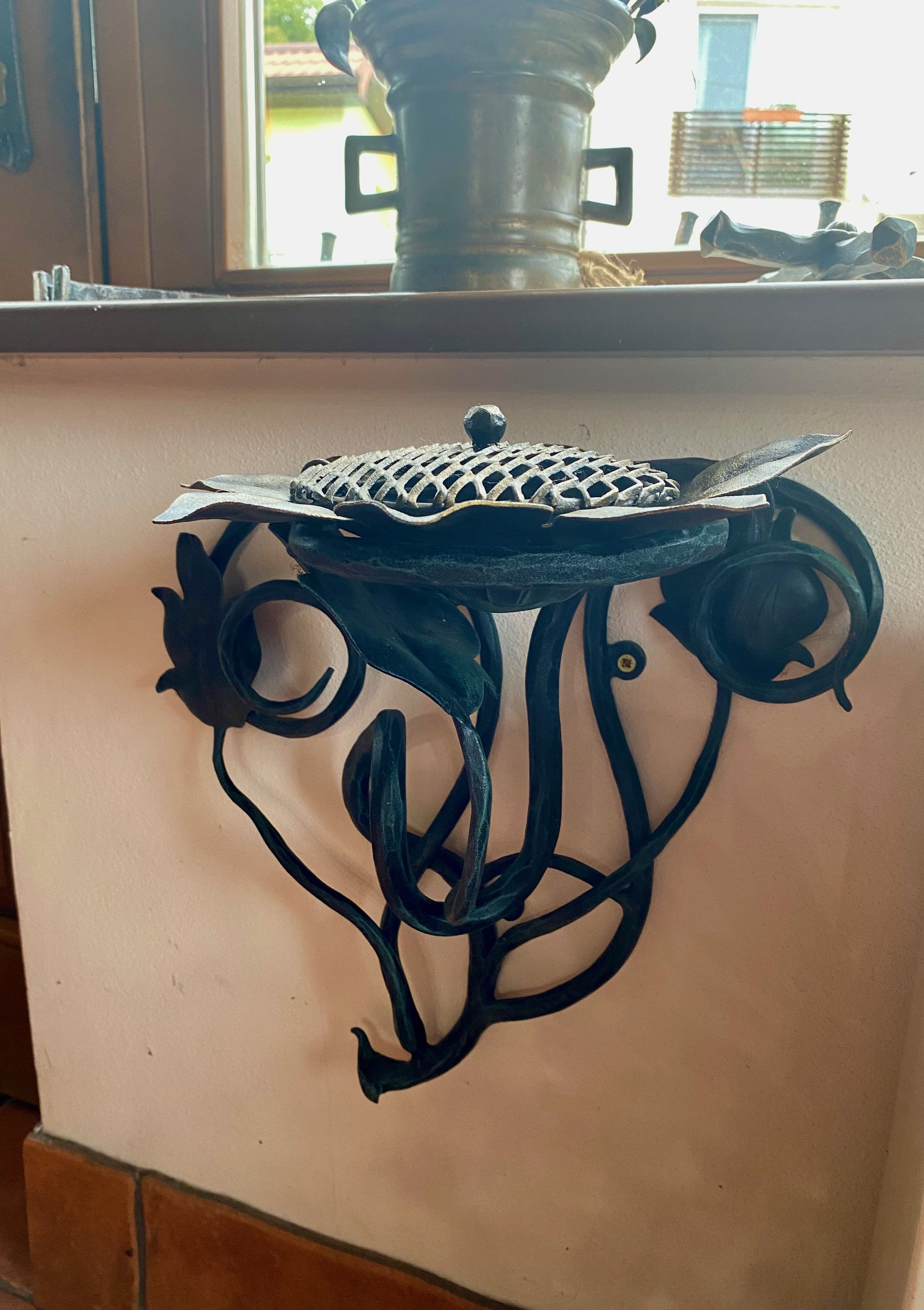 Cendrier murale en forme de tournesol – accessoire exceptionnel pour votre terrasse ou tonnelle. Le cendrier de luxe est fabriqué dans une combinaison de patine dorée et verte, avec la possibilité de choisir une autre patine (argentée, cuivrée) ou simplement une couleur noire. Si vous préférez une autre option, veuillez l'indiquer dans les remarques.